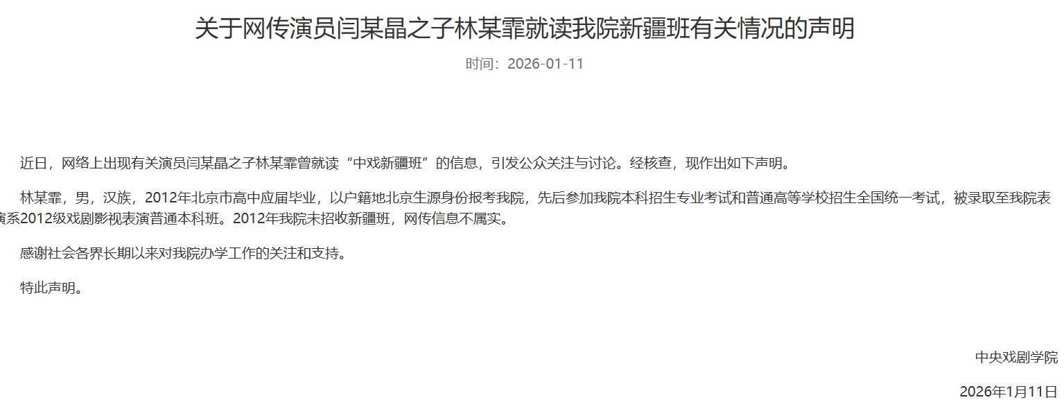 【大河财立方消息】1月11日,中央戏剧学院发布声明,回应“网传演员闫某晶之子林某霏就读‘中戏新疆班’”一事。